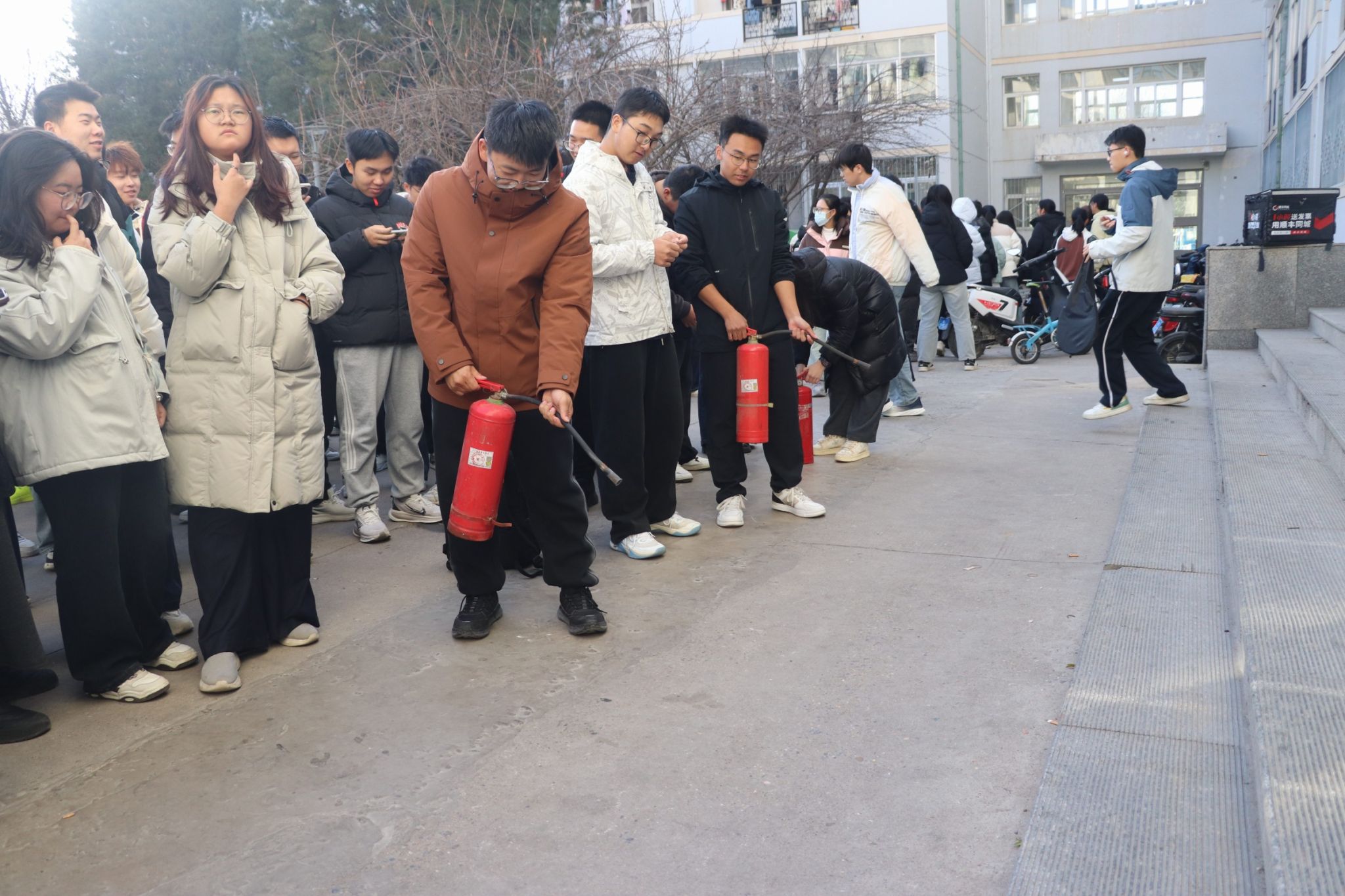 学生科于老师,在现场总结中强调:“我们通过本次演练达到以下效果,第一,熟悉逃生路线和流程,在嘈杂紧急的情况下,能够保持冷静,迅速有序撤离;第二,掌握基本自救技能;第三,强化消防安全意识和集体协作精神。接着于老师讲解演示了干粉灭火器的使用方法,强调了“提,拔、握、压”四字要领。在老师的指导下,同学们亲自体验了灭火器的使用,实现“理论知识”到“实践技能”的转化。